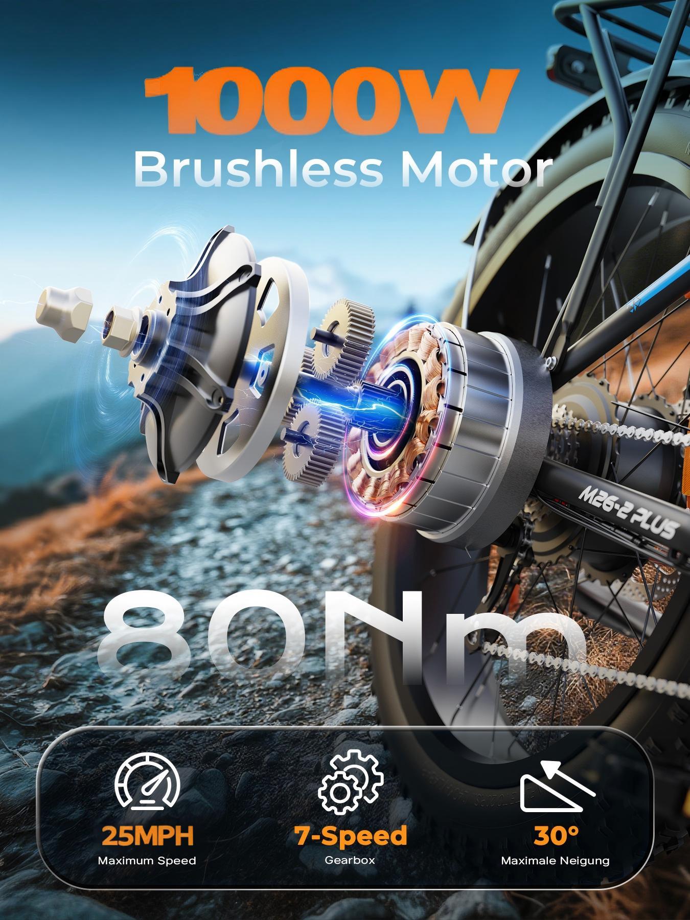 The M26-2 PLUS can reach speeds up to 25–28 MPH depending on terrain and rider weight. Its powerful 1000W brushless motor ensures fast acceleration while maintaining stability.