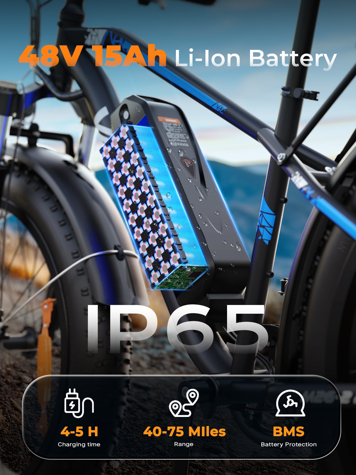 Go the distance with a 48V 15Ah lithium battery. Enjoy 45–50 miles on pure electric mode and up to 60–70 miles with pedal assist, perfect for both daily commutes and weekend adventures. - 26"x4.0" Fat Tires for All Terrains
