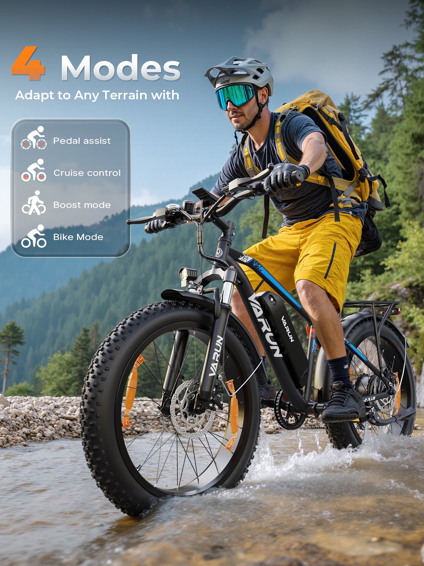 The bike offers 4 riding modes: Pedal Assist, Cruise Control, Boost Mode, and Bike Mode. Each mode adapts to your terrain and riding style for a customizable experience.