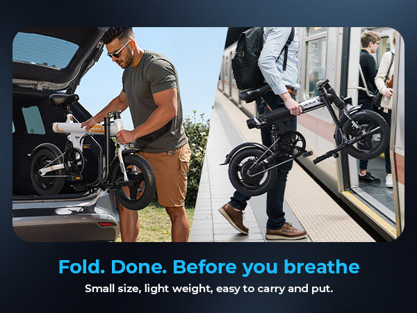 Yes! The compact 48.8" × 21.65" × 28.35" foldable design allows you to store it in your car trunk, apartment, or office. Weighing only 49.6 lbs, it’s easy to carry and perfect for commuters and city riders.