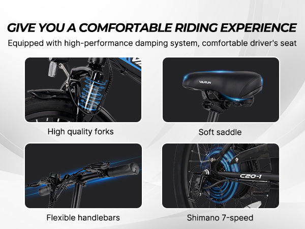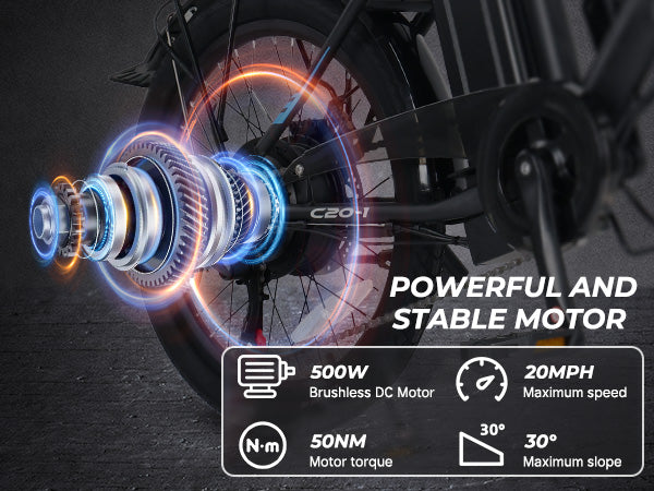 The VARUN C20-1 features a high-speed 500W brushless DC motor that delivers a peak output of 750W. With 55Nm of torque, this electric bike for adults easily tackles 30° inclines and reaches a top speed of 20 MPH.