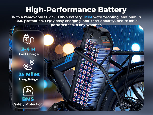 The bike is built for all-weather reliability with an IPX4 waterproof rating. While it can handle splashes and light rain, we recommend avoiding deep puddles or heavy downpours to protect the electrical components.