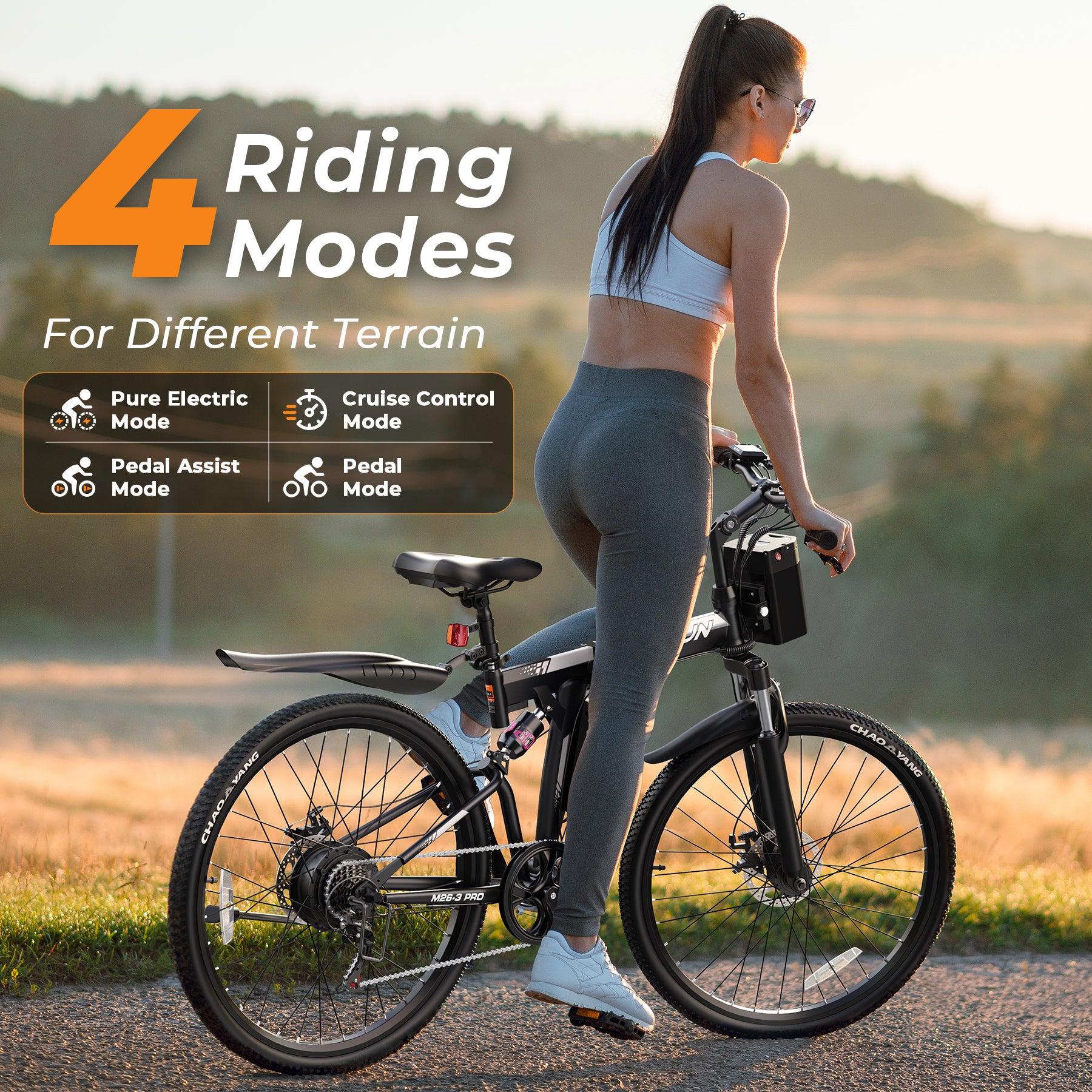 The M26-3 Pro offers 4 modes: Pure Electric Mode, Pedal Assist Mode, Cruise Control Mode, and Pedal Mode, allowing riders to adapt to different terrains and riding preferences.